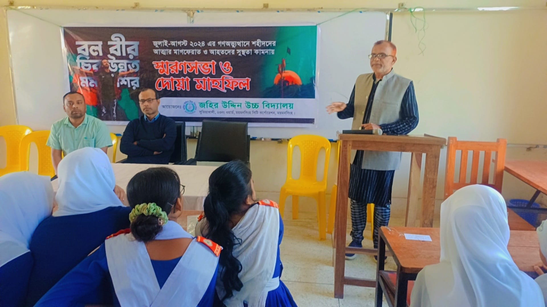 বিসমিল্লাহির রাহমানির রাহিম আসসালামু আলাইকুম জহির উদ্দিন উচ্চ বিদ্যালয়টি ময়মনসিংহ সিটি কর্পোরেশনের ২৩ নং ওয়ার্ডের সুতিয়াখালি এলাকায়, ময়মনসিংহ টু গফরগাঁও মহাসড়কের পার্শ্বে অবস্থিত। বিশিষ্ট শিক্ষাবিদ ডাঃ জলিল উদ্দিন আহমেদ এবং তৎকালীন আরও কিছু শিক্ষানুরাগী ব্যক্তিবর্গ এই ঐতিহ্যবাহী শিক্ষাপ্রতিষ্ঠানটি ১৯৪৭ খ্রিস্টাব্দে প্রতিষ্ঠা করেছিলেন। আমরা প্রতিষ্ঠানের প্রতিষ্ঠাতাদের বিদেহী আত্মার মাগফেরাত কামনা করছি। বর্তমানে এই বিদ্যালয়টি এসএসসি এবং জেএসসি পরীক্ষার কেন্দ্র হিসেবে ব্যবহৃত হয়। এখানে বর্তমানে ৩৫ জন শিক্ষক-কর্মচারী কর্মরত আছেন। শিক্ষকবৃন্দের যুগোপযোগী শিক্ষাদান কৌশল এবং সুন্দর শৃঙ্খলার মাধ্যমে বিদ্যালয়টিতে আধুনিক ও মানসম্মত পাঠদান কার্যক্রম চলছে। আমরা এই জনপদ থেকে অশিক্ষার অন্ধকার দূর করে আলোকিত মানুষ গড়ার লক্ষ্যে ব্রত। প্রধান শিক্ষক হিসেবে আমি আমার শিক্ষক-শিক্ষয়ত্রীদের সমন্বয়ে শিক্ষার্থীদের সুশিক্ষায় শিক্ষিত করে মানবিক মানুষ হিসেবে গড়ে তুলতে এবং দেশ ও জাতি গঠনে সহায়ক ভূমিকা পালনে বদ্ধপরিকর। আমাদের লক্ষ্য ও উদ্দেশ্য হলো, আজকের শিশুরা যেন আগামী দিনের ভবিষ্যৎ হয় এবং একটি সুন্দর ও সমৃদ্ধশালী বাংলাদেশ বিনির্মাণে আত্মনিয়োগ করতে পারে। বিদ্যালয়ে শিক্ষার্থীদের জন্য ডিজিটাল ল্যাব, বিজ্ঞানাগার এবং একটি আদর্শ পাঠাগার বিদ্যমান। পাশাপাশি, সহ-শিক্ষা কার্যক্রম সুন্দরভাবে অনুশীলনের জন্য একটি সুবিশাল খেলার মাঠ রয়েছে, যা শিক্ষার্থীদের মানসিক বিকাশে সহায়ক ভূমিকা পালন করে। বিদ্যালয় পরিচালনা পর্ষদের সুদক্ষ পরিচালনা, সমাজের শিক্ষানুরাগী ব্যক্তিবর্গ এবং সর্বস্তরের জনগণের সহায়তায় "জহির উদ্দিন উচ্চ বিদ্যালয়"কে একটি আদর্শ ও শ্রেষ্ঠ শিক্ষাপ্রতিষ্ঠান হিসেবে গড়ে তোলাই আমাদের লক্ষ্য। আল্লাহর বিশেষ রহমতে সকল শ্রেণীর জনগোষ্ঠীর সহযোগিতায় এই বিদ্যালয়টি সমাজের আলোকবর্তিকা হিসেবে কাজ করবে।